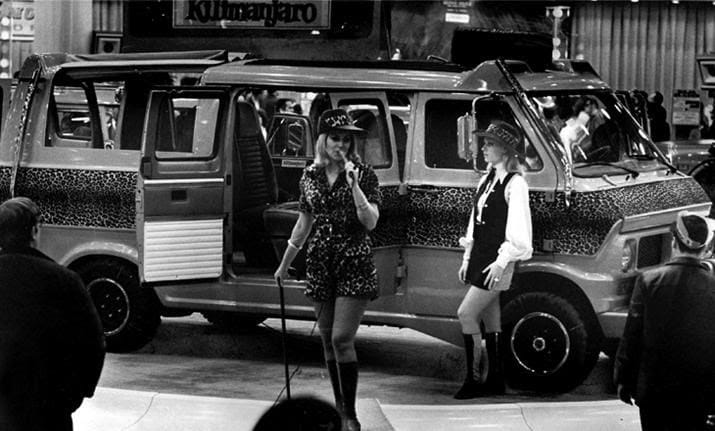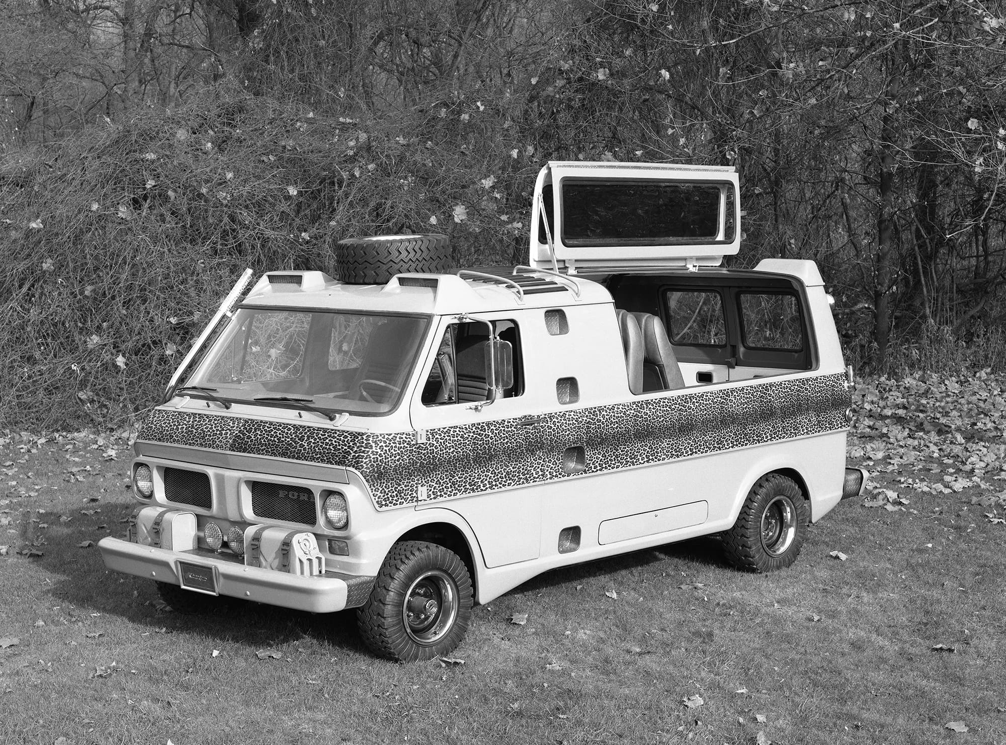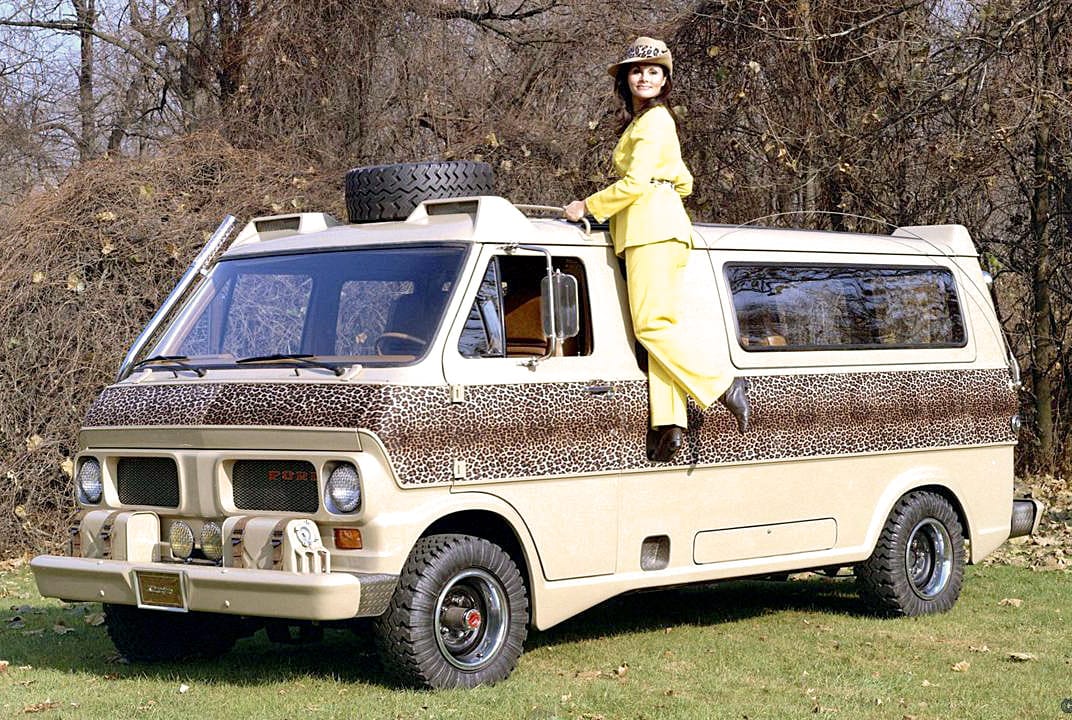 How drunk did they have to get at Ford to think that creating a low-slung ‘safari’ van was a good idea? Why did they give it leopard print craphics, or steps up to the roof in order to have Dick Tracy’s mom pose for the press materials?