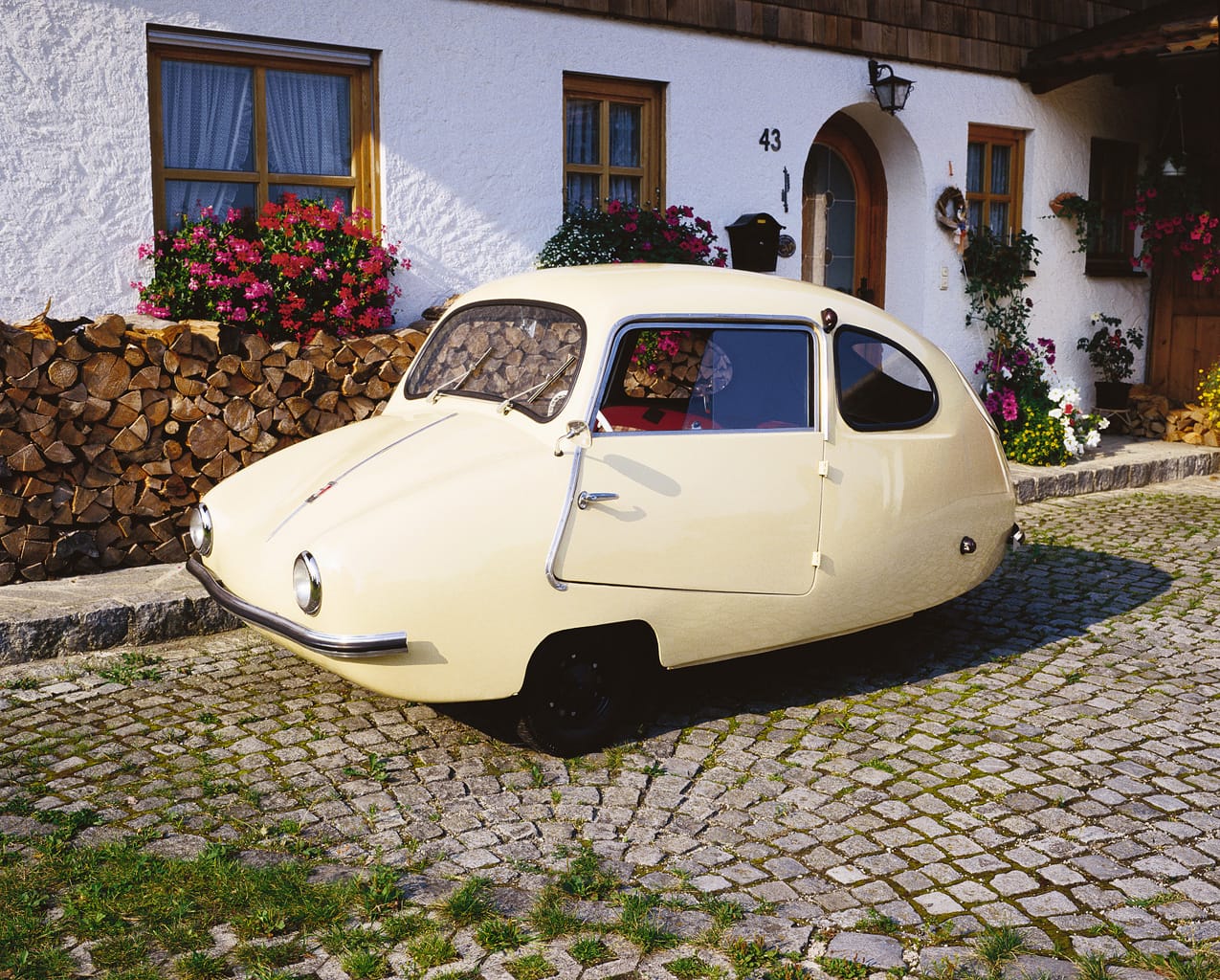 With styling designed to hint at a baby Porsche, the Fuldamobil "S" series introduced in 1954 quickly won fans for being stylish, well-built, and finally not so painfully slow. Tucked away in the little slug was a Fichtel & Sachs 1-cyl, 2-stroke engine that belted out 10 horsepower.