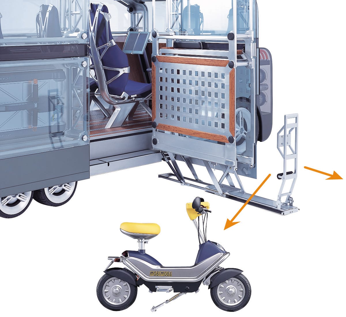 Once work is finished, Unibox had space for two folding electric minibikes (Caixa and Mobimoba) in its doors to zip its occupants away for some R&R. When batteries run dry, an onboard generator built into the Unibox was ready to supply power.