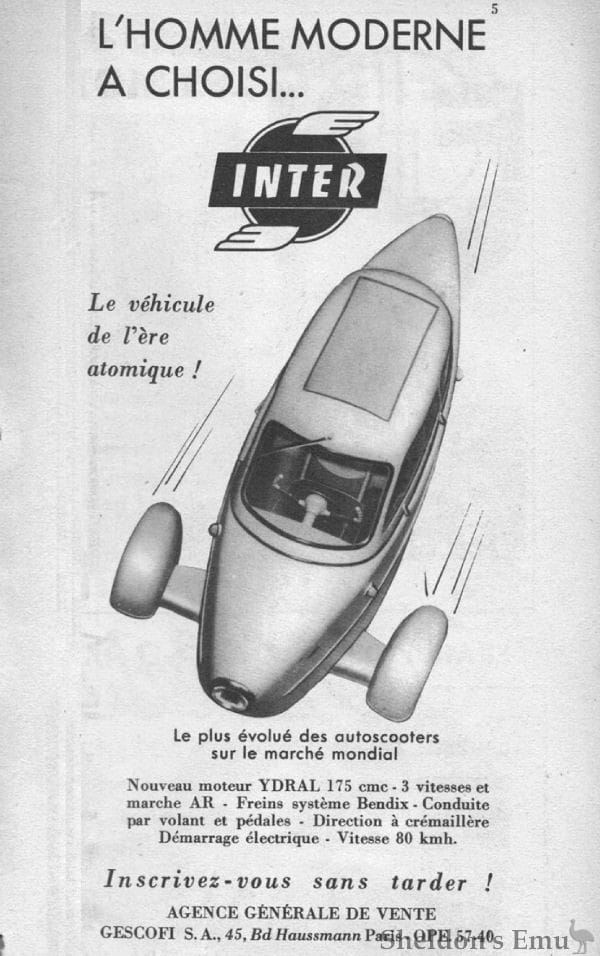 First shown at the 1953 Paris Motor Show, the Inter was a collaboration between A.E.M.S. (Ateliers Electromechaniques de la Seine) and S.N.C.A.N. (Société Nationale de Construction Aéronautique du Nord) — A.E.M.S. sent the cheques, and aircraft builders S.N.C.A.N. put them together.