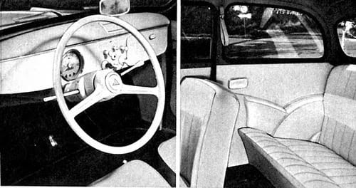 Inside, two-tone leatherette seats in beige and red were complemented by aluminum door sill plates, fancy interior trim panels with lots of chrome, wood steering wheel, and red carpet to match the bodywork: all of these coupés were painted fire engine red.