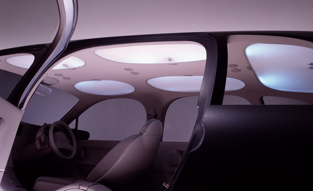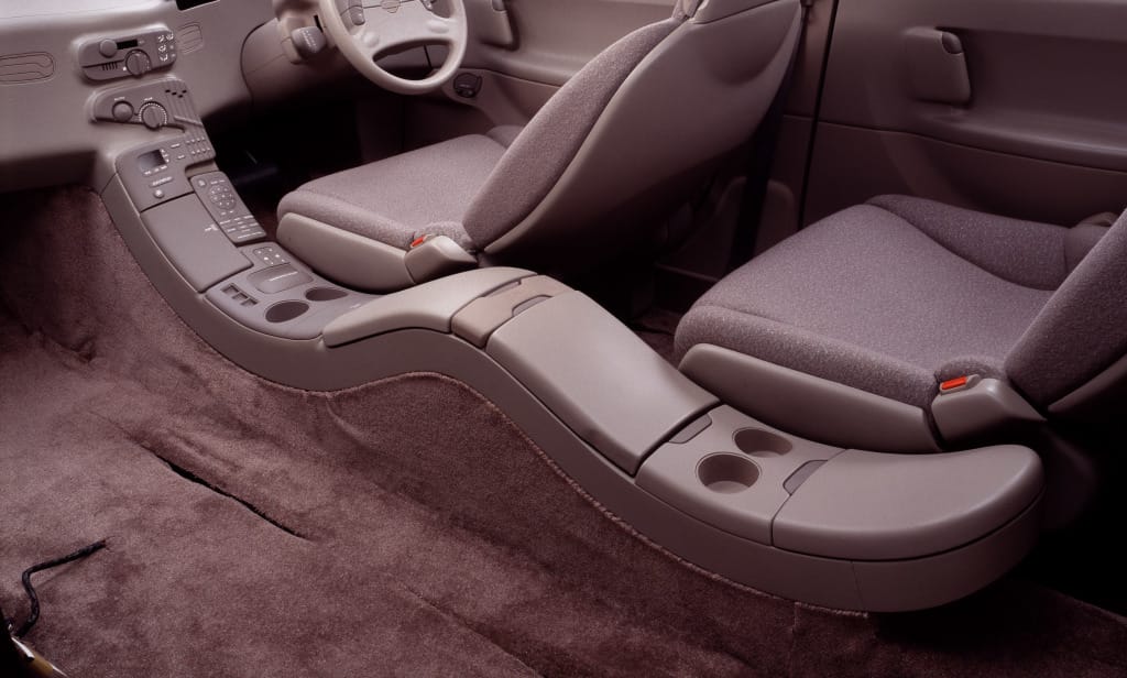 Inside, Cocoon was wild. The sides of its seats lowered to aid ingress / egress. It had navigation, a laser distance warning system, and a heads-up display (HUD). Its driver alertness monitor could mist its operator in the face with scents to aid alertness. And its three rows (2, 2, 2) were bisected by a gigantic, medical-grade pupa-inspired centre console.