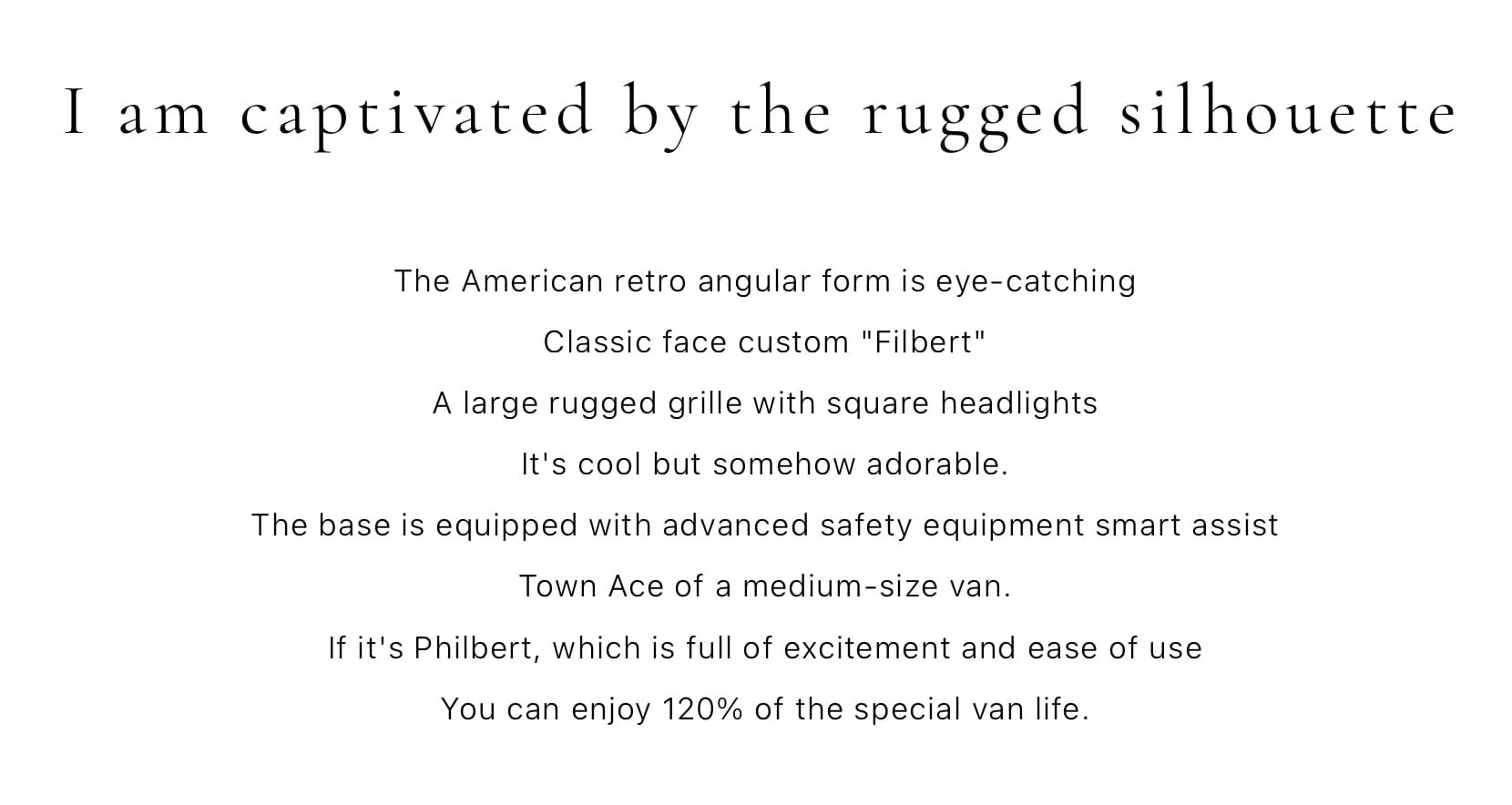From smallest to largest, Santa Rosa offers the Honda N-Van -based Malibu, Denali, and Alamo; the Suzuki Every-based Windsor; Toyota Town Ace -based Monologue, Filbert, and Filmore; and the lux Toyota Hiace-based Catalina, Sedona, and Sonoma.
